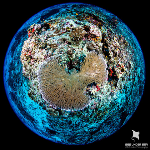 All fisheye lenses are wide-angle, but not all wide-angle lenses are fisheye. The Canon 8-15mm f/4L is a full 180° circular fisheye lens. At the 15mm zoom setting it fills the frame with a complete 180° field of view, but zoomed out to the 8mm setting, it gives a complete circular image that is surrounded by a black frame. It’s certainly not a setting that is conducive to all situations, but used judiciously and in the right conditions, it can create some very engaging images that have the viewer leaning in to get a closer look. I had found a beautiful patch of branching hard corals at a site called Lighthouse Reef at Narcondam Island, but what caught my attention was a single smaller coral head that was separated from the larger colony by about 15-20 feet. I had worked on a few close focus shots of the coral, and after getting an image I was pleased with (first image from above) I thought it would be an ideal scene to try with a full circular fisheye view. As you can see from the results, both images are interesting, but the full circular image really does leave a lot to the imagination...almost appearing to be an image of our own planet, and pulling the viewer in for a closer inspection.