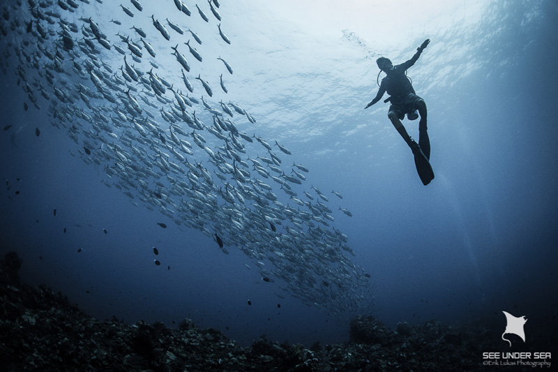 There is no better way to transport your viewer into your photo than to give them a scene they can relate to. Having a diver present in the photo is perhaps the best way to allow the viewer to relate to an image ... they can imagine themselves in the diver's position. I was framing a scene of some colorful soft corals at a dive site called Black Magic when my dive buddy tugged on my fin to alert me to the freight train of Jacks barreling past us behind my back. As I turned to look, I noticed two things: the massive size of this school of fish and one of the dive guides hovering about 8-10 feet above the bottom, and only 4-6 feet away from the school. Knowing this scene would be fleeting, I took a deep breath, cleared my mind and ran through what I would need to do to set up for this shot. I turned both of my strobes off and made two test images to adjust the camera settings for the ambient light. I then made sure the diver was placed in the upper right third of the frame, and had the fish swimming into the frame from the upper left. Without the use of strobes, I was able to capture the deep blue of the water, the diver in silhouette, and was able to use the ambient light to reflect off the silver skin of the fish.
